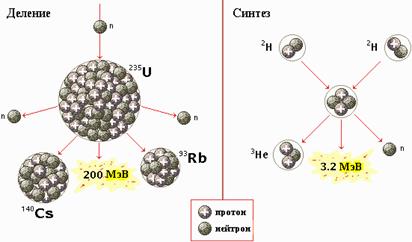 Анализ зависимости Eсв(Z, A) (см. Рис. 2) показывает, что для тяжелых ядер с Z 82 выполняется условие W0. Например, изотоп 23592U самопроизвольно распадается с полупериодом 7·108 лет. Оказалось также, что этот изотоп расщепляется при поглощении нейтрона. При этом, в каждом акте деления ядра возникают два ядра-осколка, 8-10 -квантов и в среднем 2,5 нейтронов. Если эти нейтроны вызывают новые акты деления, то возникает самоподдерживающаяся цепная реакция. При делении каждого ядра выделяется 200 МэВ (см. левую половину Рис. 5, где схематично изображена реакция