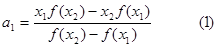 3. Чтобы получить более точное значение корня, определяем ¦(а1 ). Если на данном отрезке мы имеем ¦(x1 )<0, ¦(x2 )>0 и ¦(a1 )<0, то повторяем тот же прием, применяя формулу (1) к отрезку [a1 ;x2 ]. Если ¦(x1 )>0, ¦(x2 )<0 и ¦(a1 )>0, то применяем эту формулу к отрезку [x1 ;a1 ]. Повторяя этот прием несколько раз, мы будем получать все более точные значения корня а2 , а3 и т.д.