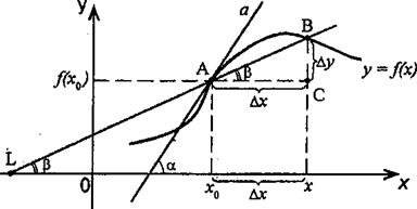Рассмотрим произвольную прямую, проходящую через точку графика функции - точку А(x0 , f (х0 )) и пересекающую график в некоторой точке B(x;f(x)). Такая прямая (АВ) называется секущей. Из ∆АВС: АС = ∆x; ВС =∆у; tgβ=∆y/∆x .