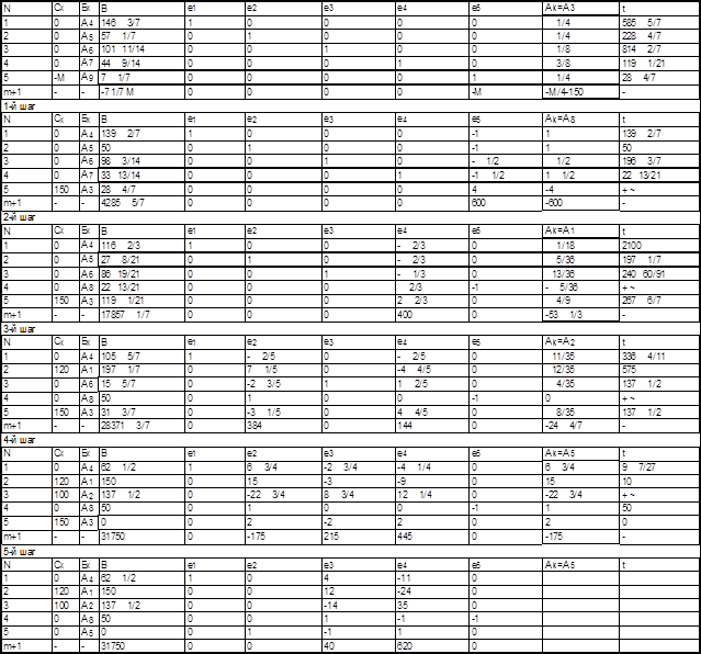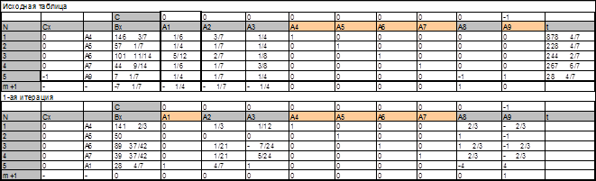 Сравнение количества вычислений на каждой итерации приводит к следующим оценочным результатам рассматриваемых алгоритмов. Преимущественная часть вычислений на каждом шаге алгоритмов определяется размерностью главной части таблицы (в первом алгоритме) или основной таблицы (во втором алгоритме). В первом случае она имеет размерность (m +1)x(n +1), во втором - (m +1)x(m +1). Даже учитывая, что второй алгоритм требует построения вспомогательной таблицы, он оказывается более компактным.
