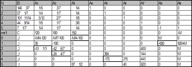 Решение М-задачи получено за 5 шагов. Оптимальный план ее равен