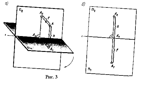 Чтобы получить плоский чертеж, совместим плоскость проекций П1 с плоскостью П2 , вращая плоскость П1 вокруг оси х в направлении, указанном на рис. 3, а. В результате получим комплексный чертеж точки А (рис. 3, б), состоящий из двух проекций А1 и А2 точки А, лежащих на одной прямой, перпендикулярной к оси х . Прямая А1 А2 , соединяющая две проекции точки, называется линией связи.