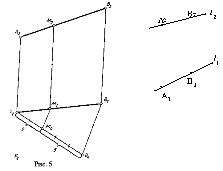 Для деления данного отрезка АВ в данном отношении достаточно разделить в этом отношении одну из проекций данного отрезка, а затем спроецировать делящую точку на другую проекцию отрезка. На рис. 5 отрезок АВ разделен точкой М в отношении 2:3, первоначально в этом отношении была разделена проекция А1