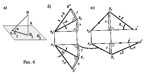 Определение натуральной величины отрезка прямой и его углов наклона к плоскостям проекций можно выполнить с помощью способа прямоугольного треугольника. Пусть дан отрезок АВ общего положения (рис. 6, а). Зафиксируем плоскость проекций П1 так, чтобы она прошла через один из концов отрезка, например через точку А, и из точки В восстановим перпендикуляр ВВ1 . Тогда получим прямоугольный треугольник АВ1 В, в котором гипотенузой является данный отрезок АВ, одним катетом является горизонтальная проекция А1 В1 отрезка АВ, а вторым катетом – высота h точки В. Угол, образованный отрезком АВ и его проекцией А1 В1 , является углом наклона отрезка АВ к плоскости проекций П1 .