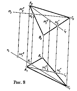 Покажем, как задать какую-нибудь точку плоскости. Пусть плоскость Q задана тремя точками А, В и С (рис. 8). Соединим их прямыми, тогда плоскость Q будет задана треугольником АВС. Проще всего искомую точку М1 задать на какой-нибудь стороне, например ВС. Проведем в плоскости Q произвольную прямую l . Выделим на плоскости Q две произвольные точки, например, А и М1 , и определим этими точками прямую l ( l1 , l2 ) , принадлежащую плоскости Q.