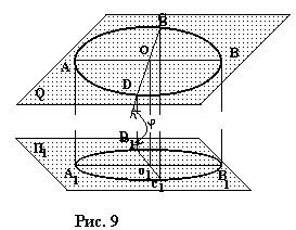 Параллельной проекцией окружности является кривая, называемая эллипсом. Так как ортогональная проекция является частным случаем параллельной проекции, то, проецируя окружность О, расположенную в плоскости общего положения Q (рис. 9) ортогонально на плоскость П1 , получаем эллипс О1 .