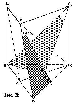 Решение (рис. 28). Выполним дополнительные построения. В плоскости ABB1 через точку A1 проведем прямую, параллельную прямой B1 А, и точку пересечения построенной прямой с прямой ВА обозначим D. Тогда угол DA1 C=2α. Соединим точку D с точкой С и проведем в треугольнике A1 CD медиану A1 К. Так как заданная призма – правильная, то ее боковые грани – равные прямоугольники, и, следовательно, B1 А=A1 C. Кроме того, B1 А=A1 D. Тогда и A1 D=A1 C, т. е. в треугольнике A1 CDA1 К┴СD. Проведем далее в равностороннем треугольнике АВС медиану ВМ. Тогда ВМ┴АС. Но ясно и то, что прямая A1 А перпендикулярна плоскости АВС, т. е. A1 А┴ВМ, или, наоборот, ВМ ┴ A1 А. Так как прямая ВМ перпендикулярна двум пересекающимся прямым плоскости AСС1 , и, значит, соединив точку М с точкой С1 , получим прямую С1 М – проекцию прямой ВС1 на плоскость AСС1 и прямоугольный треугольник С1 ВМ, угол ВС1 М которого является углом между прямой ВС1 и плоскостью АСС1 .