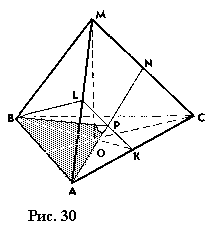Решение (рис. 30). Построим угол между плоскостями BLK и МАС. Для построения перпендикуляра из точки В на прямую LK – линию пересечения плоскостей BLK и МАС воспользуемся тем, что в треугольнике BLKBL=BK (как медианы равносторонних треугольников). Тогда медиана ВР является перпендикуляром к стороне LK. Так как в треугольнике ALKAL=AK, то медиана АР перпендикулярна стороне LK. Таким образом, угол между прямыми ВР и АР – угол между плоскостями BLK и МАС.