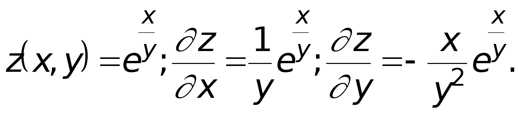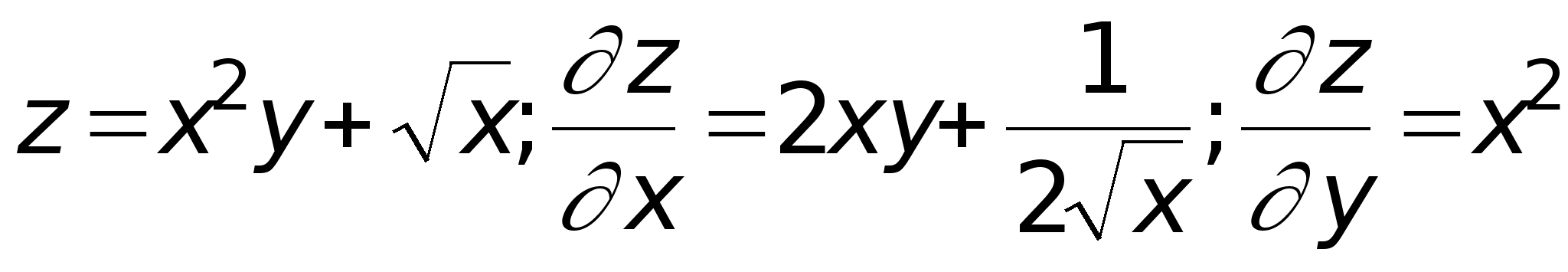 Приведем примеры вычисления частных производных. Как говорилось выше, для вычисления частной производной по x функции z = f(x,y) нужно положить переменную y равной константе, а при нахождении частной производной по y нужно считать константой переменную x.