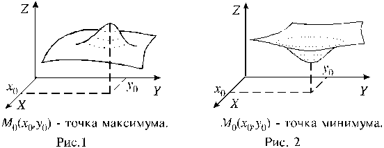 Точка M0(x0,y0) является точкой максимума (минимума) функции z = f(x,y), если найдется такая окрестность точки M0, что для всех точек M(x,y) из этой окрестности выполняется неравенство f(x,y)< f(x0,y0) ( f(x,y)> f(x0,y0)).