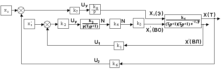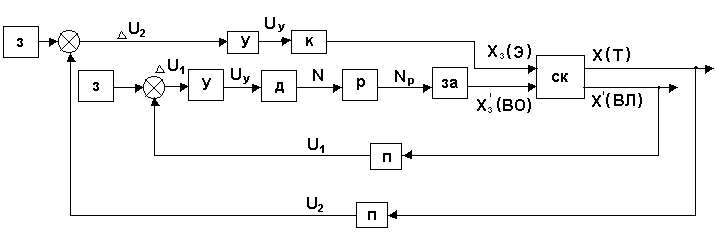 В данной курсовой работе рассматривается камера для сушки древесины. Регулирование происходит по двум контурам. Входными параметрами или параметрами регулирования являются энергия (Э) и воздух (ВО). Количество подаваемой энергии и воздуха в сушильную камеру регулируется с помощью задатчика (з). Величина задающего воздействия определяется с помощью вычислительного комплекса. Выходными параметрами сушильной камеры является температура (Т) и влажность (ВЛ). Регулирование параметров сушилки будем производить путём регулирования этих параметров. Выходные сигналы фиксируются термометрами, затем преобразуются специальными преобразователями (п) в напряжение (U1 и U2). Далее сигналы поступают на соответствующие сумматоры, где происходит сопоставление значений c заданным. Разностная величина усиливается усилителями (у). Срегулированная и усиленная величина по влажности поступает в двигатель (д). Обороты двигателя через редуктор (р) преобразуются в отклонение заслонка (за). Заслонка, в свою очередь, регулирует влажность в камере. При влажности больше заданной, пар необходимо выпустить, - заслонка открывается, и наоборот. Температура в камере регулируется при помощи клапана, т.е. при превышении заданной температуры клапан открывается, воздух выходит, температура понижается и наоборот.
