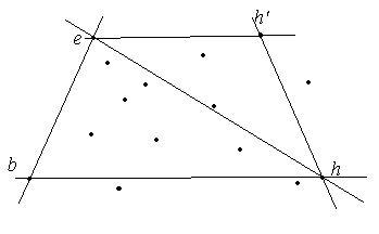 Суть алгоритма состоит в том, что исходное множество S из N точек разбивается на два подмножества, каждое из которых будет содержать одну из двух ломаных, которые при соединении образуют выпуклую оболочку. Для начала нужно определить две точки, которые будут являться соседними вершинами выпуклой оболочки. Можно взять самую левую вершину, пусть это будет b , и самую левую относительно b из оставшихся, пусть это будет e . После чего нужно найти точку h максимально удаленную от прямой be . Все точки, лежащие в треугольнике bel исключаются из дальнейшего рассмотрения. Остальные точки будут делиться на два подмножества: точки, которые лежать левее bh и eh , и точки, которые лежатправее и bh , и eh . Каждое из них содержит ломаные которые в сочетании с e , b и h дают выпуклую оболочку. С каждым из них проделываем то же самое. В подмножестве точек S’ , лежащих левее bh и eh выбираем h ’, максимально удаленную от eh , которая делит его на три части. Из них одна выбрасывается, а остальные делятся опять. Это реализуется рекурсивной процедурой, которая для данного ей множества возвращает соответствующую часть выпуклой оболочки.