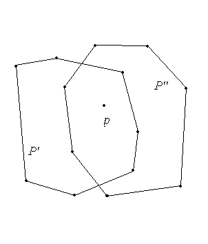 Пусть у нас есть выпуклые многоугольники P ’ и P ’’. Нам требуется найти P – их слияние. Этого берется любая внутренняя точка p для P ’ и проверяется на принадлежность P ’’. Если она принадлежит, то по теореме 4 мы имеем два упорядоченных относительно полярного угла к p множества. За время равное сумме точек в них мы можем из них получить один упорядоченный список. После чего, используя обход Грэхема за такое же время получить требуемый выпуклый многоугольник.