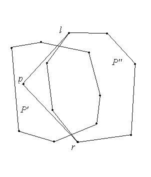 В случае, когда p не принадлежит P ’’, придется найти левую и правую опорные прямые из p к P ’’, pl и pr соответственно. Опорной прямой к выпуклому многоугольнику P будем называть прямую l , проходящую через некоторую вершину этого многоугольника, таким образом, что внутренность P находится по одну сторону от l. Для этого нам достаточно время O (N ). Все вершины P ’’ между l и r , при движении от l к r против часовой стрелки, убираем из рассмотрения и выполняем те действия, которые выполняли в случае принадлежности.