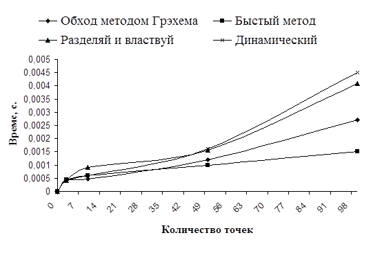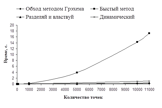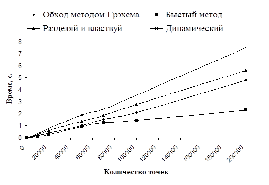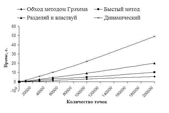 Как видно в данном случае алгоритм Грэхема оказался самым эффективным. Быстрый метод в этом случае не выбрасывает на каждом шаге точек, но так как делит их примерно на равные части, то получается, что он работает примерно время O (N log N ), что вполне приемлемо. Что касается динамического построения, то в процессе добавления точек в дерево попадают все вершины, а так как при работе с AWL деревом в моей реализации используются сложные операции с указателями то и процедура получилась медленной.