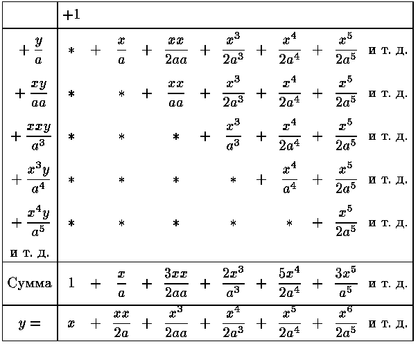 Предполагая, что мне предложено было найти выражение для y лишь до шестой степени x , я в силу этого опускаю при действии все члены, которые, как я предвижу, не будут использованы; это отмечается знаком "и т. д.", который я ставлю вместо отсеченных частей рядов»
