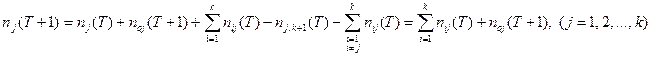 Размеры запасов изменяются из-за наличия потоков , направленных как в систему, так и из системы (набор и увольнение), а также за счет внутренних перемещений (по большей части за счет перехода сотрудников в класс с повышенной зарплатой). Предположим, что из запаса ni (T ) число людей ni j (T ) перемещается в класс j ко времени T + 1 и что ni, k +1 (T ) человек покидают университет. Тогда запас в классе i в момент T + 1 состоят из оставшихся со времени Т плюс вновь прибывшие; последние обозначаются через n0 i (T + 1). В результате соотношение между запасами и потоками записывается следующим образом: