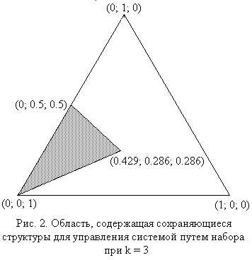 Эти точки нанесены на рис. 2 , и область, содержащая сохраняющиеся структуры, есть треугольник. Сделаем проверку. Возьмем, например, структуру (0.429; 0.286; 0.286), домножим ее на общий размер системы N = 450: (193.05; 128.7; 128.7) и подставим в (13), тем самым мы найдем управляемый вектор набора r = (1; 0; 0). Легко проверяется, что структура (193.05; 128.7; 128.7) сохраняется при заданных P , w и найденном r (воспользовавшись, например, программой uspsvu1.m) .