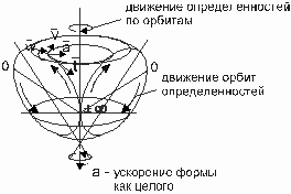 Существует связь между степенью асимметрии формы, динамикой ее элементов и поведением ее как части в целом. В отличии от симметричной, асимметричная форма имеет движение орбит определенностей поверхности к своему центру, чем определяется ее внешнее движение в целом. Движение связано с ускорением, поскольку любое движение есть движение по орбите замкнутой на себя неопределенности. Причину внешнего ускорения формы следует искать во внутренней динамике ее поверхности. Его несложно там найти. Операцию математического интегрирования векторов линейного ускорения по всей поверхности формы для наших целей образного представления можно заменить логическим интегрированием: