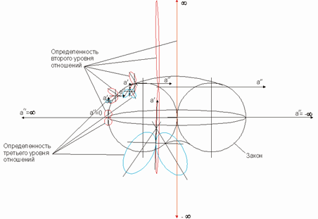 Третье по уровню отношение вносит фактор величины. Чем ближе целое, часть которого оцениваемая определенность представляет, к центру формы закона, тем больше ее величина, или объем. Позиция регистратора здесь будет на большем диаметре целого, представленного на рисунке определенностью второго уровня отношений.