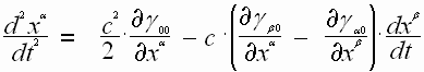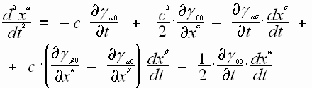 В поле тяготения, которое не меняется со временем (стационарный случай), все частные производные метрического тензора по времени равны нулю, то выражение ускорения частицы примет вид: