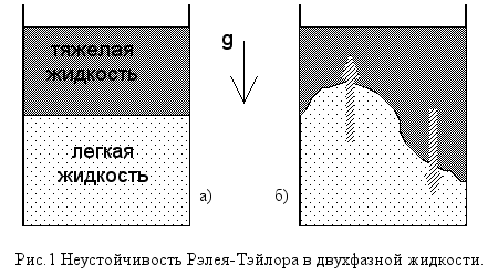 Основные черты развития нестабильности в жидкости можно проиллюстрировать на конкретных примерах. Рассмотрим две жидкости, находящиеся в сосуде (Рис.1а). Пусть более тяжелая жидкость расположена наверху, а граница их раздела абсолютно плоская. Такая ситуация, конечно же, невыгодна с точки зрения потенциальной энергии всей системы. Значит, более тяжелая жидкость будет стараться опуститься вниз. Однако просто так опуститься она не может: ведь она должна куда-то вытеснить находящуюся под ней более легкую жидкость. Как она может это сделать? Ответ известен всем из жизненного опыта: в одной части сосуда тяжелая жидкость будет опускаться вниз, а в другой будет всплывать легкая жидкость (Рис.1б).