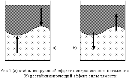 При небольшом отклонении жидкости от равновесия обычно существуют два класса сил (Рис.2): силы, которые стараются вернуть жидкость обратно в положение равновесия (стабилизирующие силы), и силы, пытающиеся увести систему как можно дальше от положения равновесия (дестабилизирующие силы). В нашем случае к первому классу сил относится сила поверхностного натяжения. Эта сила старается минимизировать поверхность раздела двух жидкостей, выпрямить ее (Рис.2а). Ко второму классу относится сила тяжести: Земля притягивает тяжелую жидкость сильнее, и потому усиливает отклонения (Рис.2б). Итак, мы видим, что динамика жидкости в данном примере определяется противоборством двух конкурирующих сил. Важно еще и то, что обе эти силы одинаковым образом (линейно) зависят от величины отклонения. Поэтому оказывается, что та сила, которая "перевешивает" при небольшом отклонении, будет перевешивать и при любом другом отклонении. То есть, если возвращающая сила оказывается больше, все случайные отклонения от положения равновесия будут "гаситься", а значит, равновесие сохранится. Если же поверхностное натяжение не столь сильно, то преобладать будет сила тяжести, а значит, любое, даже самое маленькое возмущение будет быстро усиливаться, пока, наконец, не перерастет в течение, охватывающее всю систему. Именно такая ситуация и называется неустойчивостью Рэлея-Тэйлора.