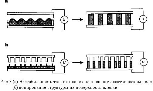 Интересно, что с помощью такого явления можно "копировать" сложные структуры субмикронного масштаба с заранее приготовленной матрицы на полимерные пленки. В самом деле, если верхний электрод содержит какую-то структуру, какой-то "узор", то, как показано на Рис.3б, "узор" на поверхности полимерной пленки будет в точность его повторять. Это и неудивительно: ведь нестабильность поверхности пленки наступит раньше там, где сильнее электрическое поле, а именно, непосредственно под выступами верхнего электрода. Именно на это важное приложение нестабильности полимерных пленок и делается основной акцент в статье. Ведь по этой методике можно быстро и дешево "штамповать" сложные конструкции, например, элементы интегральных схем.