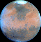 Рис. 1. Марс, хотя и напоминает пустыню, обладает сложным гидрологическим циклом. На этом снимке, полученном группой наблюдателей НАСА на Хаббловском телескопе, видна Северная полярная шапка и глобальная система облаков, опоясывающая тропики планеты во время прохождения афелия. В средних широтах заметны волновые атмосферные структуры, аналогичные тем, что порождают циклоны и антициклоны на Земле.