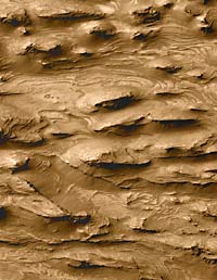Пока готовилась эта статья, появился пресс-релиз НАСА, торжественно сообщающий, что наконец найдены неоспоримые доказательства жидкой воды на Марсе. В ущелье Кандор обнаружены террасы, которые могли возникнуть в результате длительных осадочных процессов на дне древнего водоема. Правда, авторы тут же оговариваются, что это не единственно возможная интерпретация, в принципе, такие террасы могли возникнуть и в результате «сухого» атмосферного выветривания. Но пейзаж, без сомнения, впечатляет: