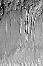 И, наконец, недавно были найдены совсем короткоживущие, не более нескольких десятков лет, структуры, похожие на следы просачивающейся из-под корки вечной мерзлоты жидкой воды. Характерно, что все такие «родники» обнаружены на северных склонах глубоких каньонов, где атмосферное давление хоть ненадолго, но позволяет сохранить воду от моментального холодного вскипания. Разумеется, такая смелая интерпретация, основанная лишь на изображениях, встречает довольно жесткую критику. В редакционной статье нашего журнала читатель может ознакомится с точкой зрения астрофизика-релятивиста. Будучи геофизиком-планетчиком и «марсианином», я не берусь интерпретировать эти катинки тем или иным образом. Наверное, сделать это грамотно может лишь тот, кто с геологическим молотком в руках прошел не одну сотню километров по марсианским дюнам. Будут это космонавты или автоматические марсоходы - в любом случае решать следующему поколению. Нам же остается уповать на самый надежный дистанционный метод - инфракрасную спектроскопию. Если ТЭС уверенно покажет молодые отложения минералов, характерных для открытых источников воды, скажем, растворимых солей, вблизи этих «ручейков» - значит, скорее всего, вода действительно есть. Читателя, всерьеез интересующегося возможным устройством современных грунтовых вод на Марсе, отсылаю к работе [6].