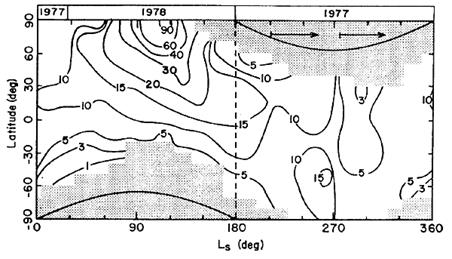 Но марсианская гидрология – это не только палеоклимат и вечная мерзлота. Современный цикл марсианской воды – это еще около 1014 г паров в атмосфере, те самые 10-30 микрон осажденной воды, а также облака, хорошо заметные в виде белесой дымки на изображении, полученном Хаббловским телескопом (Рис. 1). Кроме того, это сезонные полярные шапки и ночные туманы, оставляющие на поверхности планеты микроскопический слой инея. Наконец, это и «дыхание» реголита, за миллиарды лет раздробленного метеоритами глинистого грунта, обладающего хорошими абсорбционными свойствами. Несмотря на относительно небольшой объем атмосферных запасов воды, именно атмосферные процессы играют определяющую роль в поддержании современного состояния поверхностных резервуаров марсианской воды. А состояние это не вполне обычное: оказывается, в Северном полушарии воды почти на порядок больше, чем в Южном! Чем могла быть вызвана подобная асимметрия? Имеет ли это какое-либо отношение к климатическим катастрофам прошлого? Чтобы разобраться, что происходит с водой в атмосфере, на борту орбитальных аппаратов "Викинг" были установлены высококлассные даже по лабораторным меркам спектрометры MAWD (Mars Atmospheric Water Detector) с разрешающей силой l /d l » 7500, настроенные на полосу водяного пара 1.38 мкм. Приборы успешно отработали на двух аппаратах в течение двух марсианских лет в 1976-79 годах (Марс делает полный оборот вокруг Солнца за 668 земных суток). Правда, специфика тогдашней технологии позволяла передавать на Землю не спектры, а лишь относительные значения яркости на нескольких длинах волн, по которым впоследствии восстанавливалась абсолютная влажность марсианского воздуха. По сути, прибор использовался в режиме полихроматора, что, естественно, сказалось на качестве восстановленной информации. Полученная в результате обработки данных MAWD карта в координатах "сезон-широта" (Рис. 6) указывает на явную межполушарную асимметрию: южное лето намного суше северного. Естественной причиной этого кажется асимметрия самих полярных шапок: в Северной шапке льда H2O гораздо больше, тогда как постоянная часть Южной полярной шапки состоит в основном из замерзшего CO2.