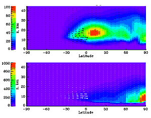 Рис. 7. Меридиональный транспорт водяного пара (рис. внизу) и аэрозоля (рис. вверху) в атмосфере Марса вблизи афелия по результатам численной модели общей циркуляции. Цветами указаны концентрации в ppm (массовая доля * 10-6), шкала дана с левой стороны каждого рисунка. Стрелки обозначают плотность потока каждой примеси, т.е. призведение концентрации и зонально-средней скорости.