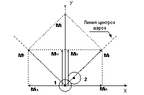 Массы шаров для простоты все равны. Если, как было показано выше, результирующий импульс после столкновения сложится из двух проекций на ось