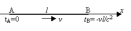 Выделим на оси х-ов ИСО некоторый отрезок АВ длиной l (cм. рисунок). Эта длина определена в ИСО с помощью её же эталона длины (собственная длина). Если взять в какой-то момент в точках А и В "синхронизированные" в ИСО часы и принять показания часов в точке А за нулевые ( tА= 0), то часы в точке В в этот же момент должны показывать время tВ = - vl/c2(это следует из преобразований Лоренца). Всё это мы одновременно видим из АИСО с её абсолютным ходом времени и её абсолютной одновременностью. И это подтверждает нам, что одновременные разноместные события в АИСО уже не воспринимаются как одновременные в ИСО. Именно не воспринимаются, в то время как в существующей трактовке СТО утверждается, что не являются одновременными. А ведь это совершенно разные вещи.