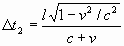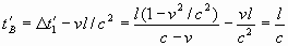 Теперь представим себе, что в ИСО вдоль отрезка АВ движется некоторое тело. Оно выходит из точки А как раз в тот момент, когда часы в ней показывают нулевое время. Далее, оно через промежуток времени t по часам в А достигает точки В. Спрашивается, сколько длилось в данной ИСО его движение от А к В? И если мы скажем, что эта длительность и равна t, то будем неправы, так как мы должны определить эту длительность движения тела в ИСО от А к В по разности показаний часов в В в конце движения и в А в начале движения. А так как показания часов в А в начале движения были нулевые, то “синхронизированные” часы в В в конце движения будут показывать время tВ= t–vl/c2, так как они имеют показанный выше постоянный сдвиг в своих показаниях по отношению к часам в А. И мы видим, что, несмотря на то, что движение тела от А к В в ИСО по темпу хода её часов фактически длилось t, и часы в А и в В продвинулись именно на столько же делений, время движения будет измерено иначе. Вот почему мы и оговорились выше, что промежуток времени в движущейся ИСО не всегда измеряется как отношение длительности какого-либо процесса в ней к длительности эталонного движения за это же время.