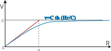 С учетом релятивистских эффектов условие соответствия космологическому принципу постоянства пространственного прироста скоростей приводит не к строго линейной зависимости наблюдаемой скорости от расстояния, а к гиперболической, по правилу гиперболического тангенса.