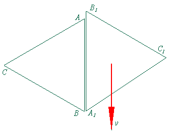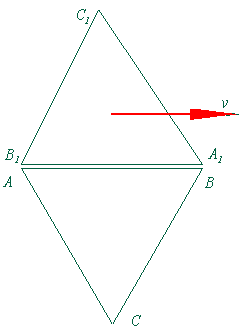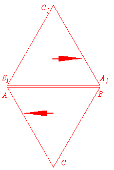 Рис. 1. Начальная позиция равносторонних треугольников. Стороны AB и B1A1 параллельны друг к другу и соприкасаются (отчётливо показанная щель между ними на самом деле отсутствует). В начальном положении треугольники могут перемещаться в направлениях, показанных стрелками. AB = B1A1.