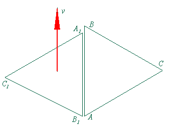 Разумеется, этот эксперимент мы делаем только с целью углубить наше понимание теории относительности. Эксперимент очень простой, но, как мы убедимся, он довольно поучительный. Представим себе два равных по величине раносторонних плоских треугольника ABC и A1B1C1. Плоскости треугольников находятся на расстоянии R от общей (неподвижной) оси вращения, вокруг которой они могут вращаться независимо друг от друга. При совпадении плоскостей треугольников прямые AB и B1 A1 параллельны, (почти) соприкасаются друг с другом, а точки C и C 1 находятся друг против друга (рис. 1). Направление возможного движения совпадает с направлением прямых AB и B1 A1. Радиус R представим очень большим (астрономических размеров).