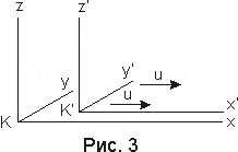 “Наша задача в точной формулировке сводится к следующему. Каковы значения x', y', z', t' некоторого события относительно движущейся со скоростью u системы координат K', если заданы значения x, y, z, t того же события относительно неподвижной системы координат K? Соотношения должны быть выбраны так, чтобы для одного и того же светового луча (причём для любого) относительно K и K' выполнялся закон постоянства скорости распространения света в пустоте. Эта задача для приведённого на рис. 3 пространственного расположения систем координат решается следующими уравнениями: