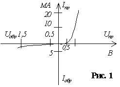 В СВЧ диодах обычно используется точечный контакт. Переход в таких диодах не формуется. Выпрямляющий контакт осуществля-ется простым прижимом к полированной поверхности полупровод-ника острия металлического контактной пружины. Эти диоды изго-товляются из очень низкоомного материала (время жизни носителей заряда мало) и имеют весьма малый радиус точечного контакта (2-3 мкм), что обеспечивает хорошие высокочастотные свойства. Однако напряжение пробоя СВЧ диодов очень низкое (всего 3-5 В), а пря-мое напряжение относительно высокое. Обратный ток у них хотя и мал, но начинает возрастать практически с нуля за счет туннельного эффекта носителей через переход (рис.1).