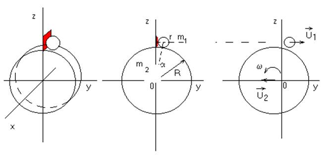 К цилиндру с радиусом основания R и массой m прикреплена жесткая невесомая платформа (центр шарика и центр цилиндра находятся в плоскости zy), на которой находится шарик, радиус которого r и масса m. После взрыва (тонкий красный слой) часть энергии перешла в кинетическую энергию цилиндра и шара E.