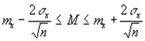 Посмотрев на формулу для математического ожидания mx, можно увидеть, что эта величина есть не что иное, как сумма большого числа случайных величин - отдельных наблюдений. Поэтому в силу центральной предельной теоремы величина mx подчиняется нормальному закону (см. рис.1), со средним (теоретическим) М и неизвестным стандартным отклонением S. Можно доказать, что S в Ц n раз меньше стандартного отклонения каждого отдельного наблюдения, для оценки которого можно использовать величину s х. Поэтому по правилу “трех s “ для Z - закона получаем, что с доверительной вероятностью р=0,997: