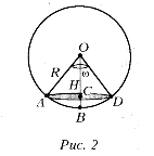 (рис. 2), где находится точечный источник света, с точкой A края стола. Перемещая прямую линию OA вокруг неподвижной точки O, получим прямой конус. Основанием конуса является круг, диаметр которого равен диаметру стола, а высота проходит через центр основания и равна расстоянию от источника света до центра стола. Поместим вершину O полученного конуса в центр сферы радиусом R. Пересекаясь со сферой, боковая поверхность конуса вырезает на ней сегментную поверхность АBD. Площадь сегментной поверхности равна произведению длины окружности большого круга на высоту сегмента, то есть