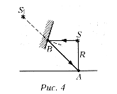 Задача 3. Точечный источник света S освещает горизонтальную поверхность (рис. 4). Определите, как изменится освещенность в точке A, в которую лучи падают перпендикулярно к поверхности, если сбоку от источника, на таком же расстоянии, поместить плоское зеркало, отражающее свет в эту точку. Коэффициент отражения зеркала считайте равным единице.