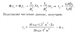 Дано: I1 = 40 кд, R1 = 1 м, t1 = 2 с, I2 = 30 кд, R2 = 1,5 м, W1 = W2. _________ t2 – ? |