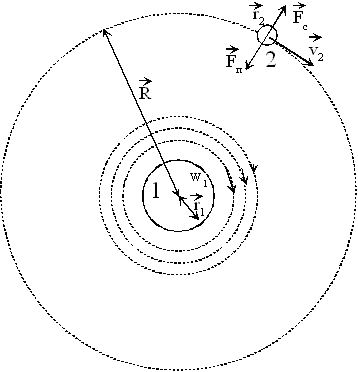 Двумерная модель гравитационного взаимодействия двух тел. Указаны силы, действующие на тело 2. Fc -центробежная сила, Fп - сила притяжения тела 2 со стороны тела 1, v2 – линейная скорость тела 2 по орбите, R – радиус орбиты, r1 – радиус тела 1, r2 – радиус тела 2, w1 – угловая скорость вращения эфира на поверхности тела 1.