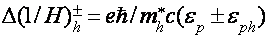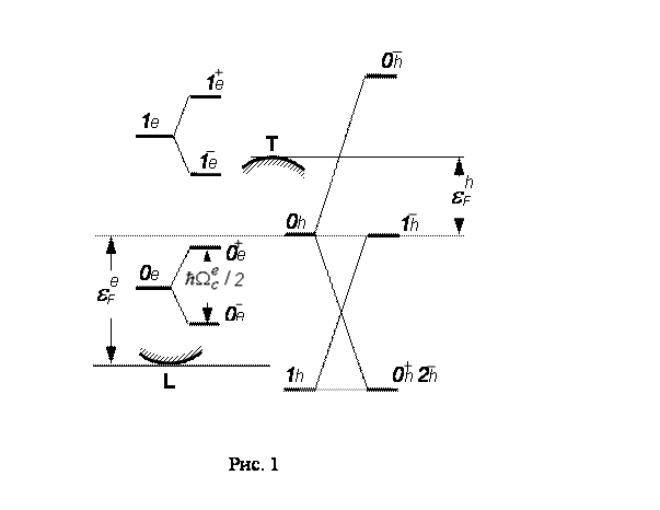 В работах [22-24] предложена модель, согласно которой осцилляции возникают в результате электрон-дырочных переходов между экстремумами подзон Ландау вблизи ферми-уровня. При этом циклотронные массы электронов и дырок должны быть кратны. В модификации данной модели [25] период осцилляций определяется комбинированной площадью