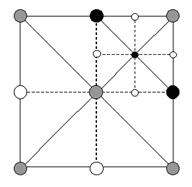 Рис 6. Пример меша. Включенные вершины помечены черным. Серые треугольники отрисованы во время рекурсивного вызова Render() для сопоставленных им подквадратов. Белые треугольники отрисоввываются во время изначального вызова Render() для этого квадрата.