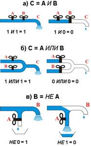 Выполнение логических операций можно проиллюстрировать на наглядной физической модели «водопровода». Представим утверждения, над которыми производятся операции, в виде вентилей на трубах (открытый вентиль — утверждение истинно, закрытый — ложно). Результат операции представим в виде крана, из которого вода может либо течь (истина), либо не течь (ложь). На рис. 2 изображены системы труб, реализующие основные логические операции. Например, рассмотрим операцию И: С = А И В (рис. 2а). Вентили А и В установлены на трубе последовательно, поэтому вода из крана С течет, только если они оба открыты. Если же установить вентили на две параллельные трубы, соединяющиеся в одну, то такая система будет выполнять операцию ИЛИ: если хотя бы один из вентилей А или В открыт, вода из крана С потечет, т. е. С = А ИЛИ В (рис. 2б). На рис. 2в представлена система, выполняющая операцию НЕ: если вентиль А закрыт, то вода протекает в кран В, если же он открыт, то вся вода стекает в «запасную» трубу, и через кран В не течет, т. е. В = НЕ А.